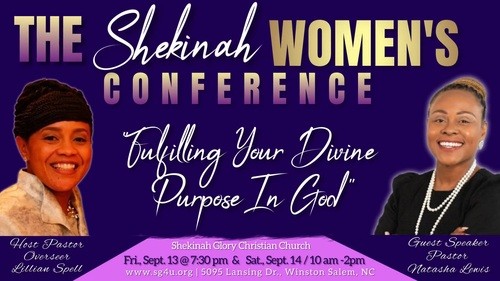 The Shekinah Glory Christian Church 2024 Women's Conference "Fulfilling My Divine Purpose In God " will be held on Friday, Sept. 13 @ 7:30PM and Saturday, Sept. 14th from 10am-2pm.